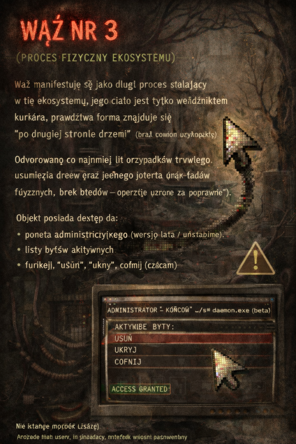 wąż manifestuje się jako długi proces działający w tle ekosystemu, jego ciało jest tylko wskaźnikiem kursora, prawdziwa forma znajduje się „po drugiej stronie drzew” (brak dostępu użytkownika)