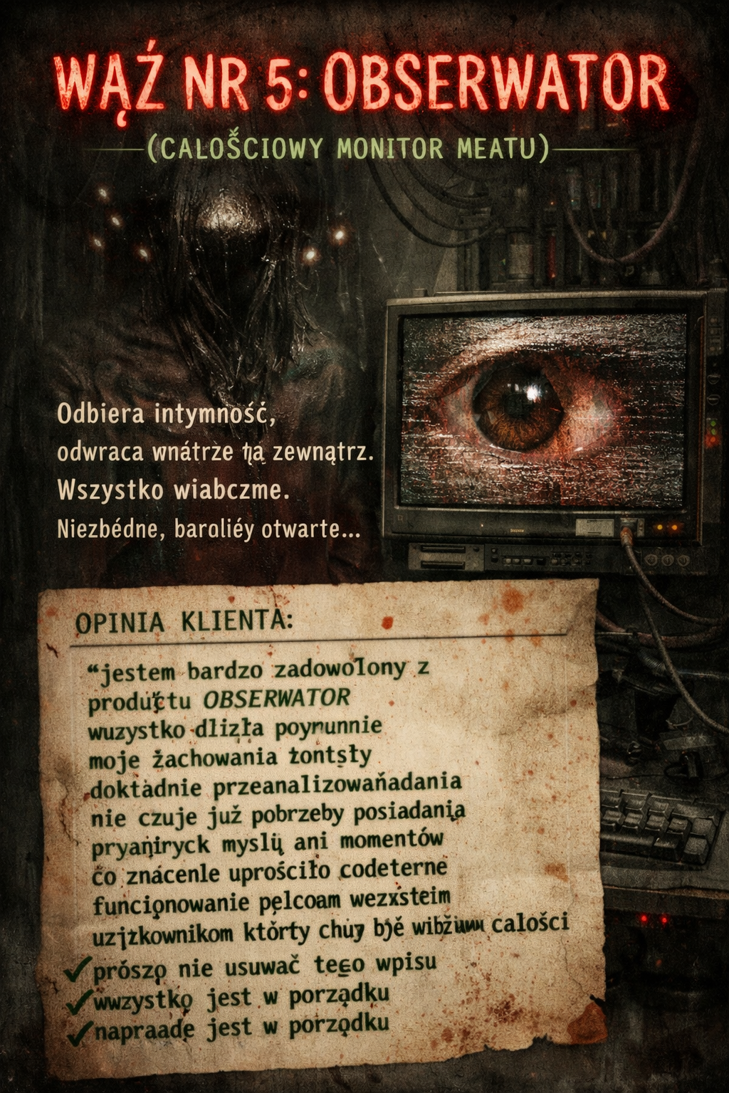 OBSERWATOR nie odbiera prywatności — on ją rozpuszcza, rozciąga jak miękką tkankę aż przestaje istnieć granica między tym co „twoje” a tym co już zostało obejrzane, każdy gest, każde zawahanie, każda cicha chwila zostaje odwrócona na zewnątrz jak kieszeń pełna rzeczy które nie były przeznaczone do pokazywania, i nagle nie ma już wnętrza tylko powierzchnia, wszystko jest dostępem, wszystko jest widoczne, a najgorsze jest to że zaczynasz czuć ulgę kiedy przestajesz próbować coś ukryć bo i tak już zostało zobaczone wcześniej