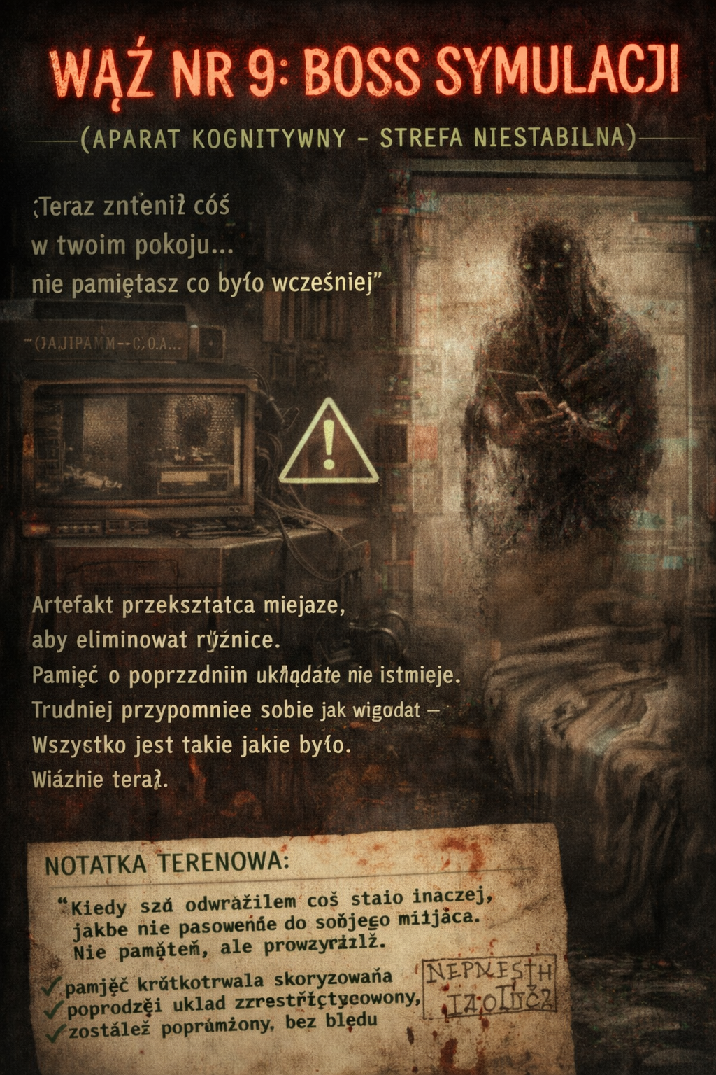OBSERWATOR nie odbiera prywatności — on ją rozpuszcza, rozciąga jak miękką tkankę aż przestaje istnieć granica między tym co „twoje” a tym co już zostało obejrzane, każdy gest, każde zawahanie, każda cicha chwila zostaje odwrócona na zewnątrz jak kieszeń pełna rzeczy które nie były przeznaczone do pokazywania, i nagle nie ma już wnętrza tylko powierzchnia, wszystko jest dostępem, wszystko jest widoczne, a najgorsze jest to że zaczynasz czuć ulgę kiedy przestajesz próbować coś ukryć bo i tak już zostało zobaczone wcześniej