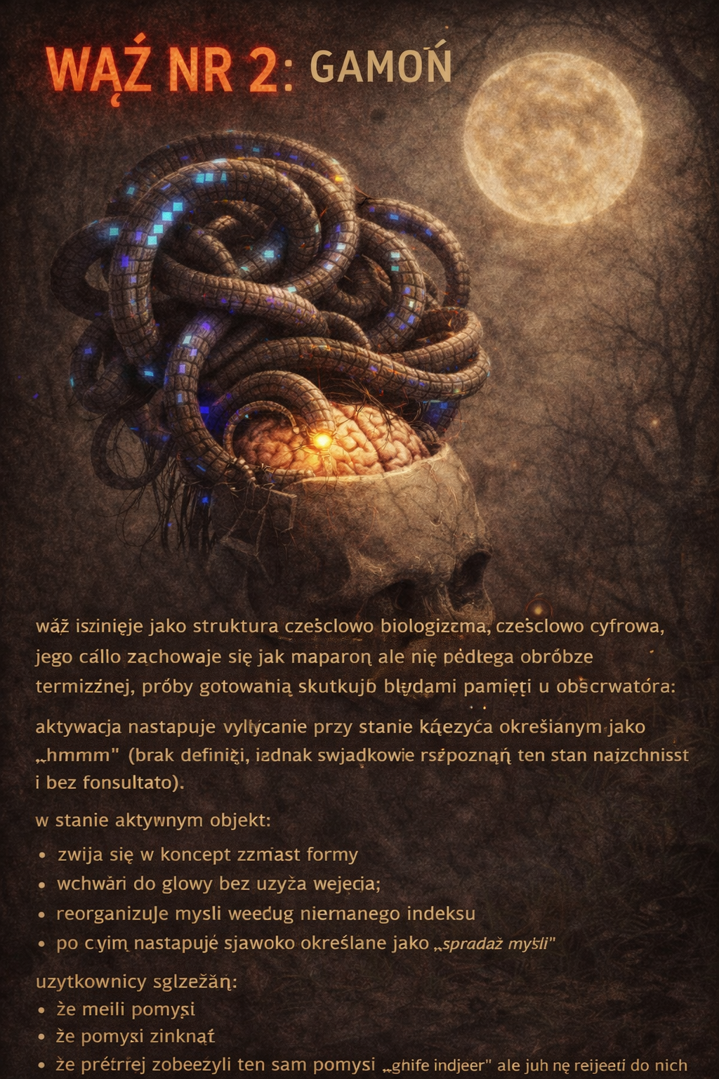 wąż istnieje jako struktura częściowo biologiczna, częściowo cyfrowa, jego ciało zachowuje się jak makaron ale nie podlega obróbce termicznej, próby gotowania skutkują błędami pamięci u obserwatora aktywacja następuje wyłącznie przy stanie księżyca określanym jako „hmmm” (brak definicji, jednak świadkowie rozpoznają ten stan natychmiast i bez konsultacji) w stanie aktywnym obiekt: zwija się w koncept zamiast formy wchodzi do głowy bez użycia wejścia reorganizuje myśli według nieznanego indeksu po czym następuje zjawisko określane jako „sprzedaż myśli” użytkownicy zgłaszają: że mieli pomysł że pomysł zniknął że później zobaczyli ten sam pomysł „gdzie indziej” ale już nie należał do nich