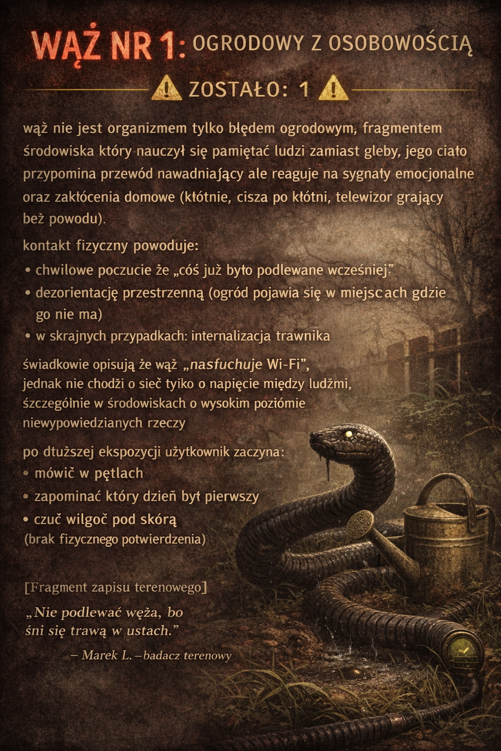 wąż nie jest organizmem tylko błędem ogrodowym, fragmentem środowiska który nauczył się pamiętać ludzi zamiast gleby, jego ciało przypomina przewód nawadniający ale reaguje na sygnały emocjonalne oraz zakłócenia domowe (kłótnie, cisza po kłótni, telewizor grający bez powodu)